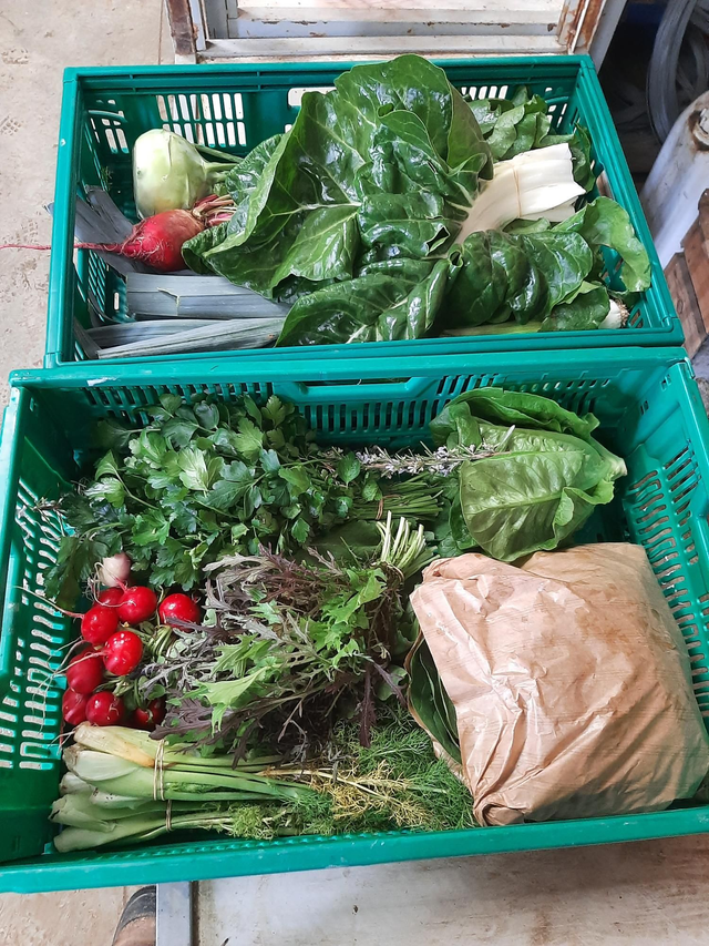 Part de récolte conséquente avec les légumes et aromates variés de la ferme pour cuisiner des plats gourmands et gourmets